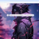 The entire scene is awash in a harmonious blend of deep blues, soft purples, and vibrant pinks that create an almost ethereal watercolor effect. Cherry blossom petals dance through the air like fragments of forgotten memories, some glowing with an inner light that suggests chakra manifestation. This powerful fusion of natural beauty and ninja mystique perfectly captures Sasuke’s complex nature as both destroyer and protector.