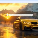 The performance coupe’s aggressive stance commands attention, with its iconic kidney grille, razor-sharp angel eye headlights, and muscular fender flares catching the warm sunrise glow. The metallic yellow paint creates a mesmerizing mirror effect on the wet pavement, doubling the visual impact and seamlessly blending car with landscape.